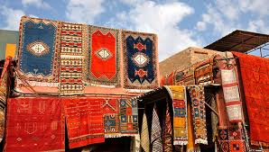 Berber rugs, woven blankets and embroidered clothing, often in bright colors and intricate designs.